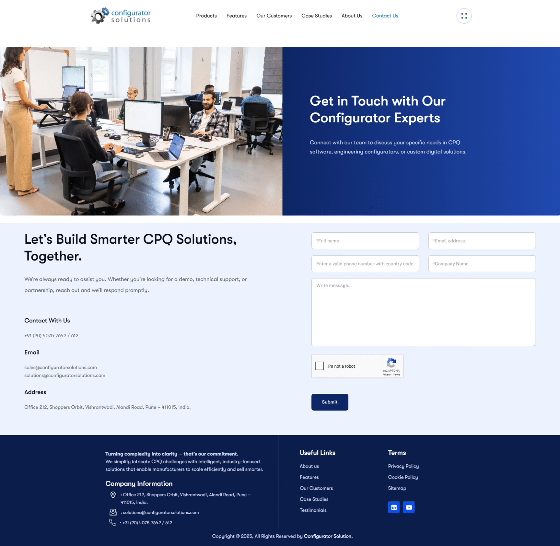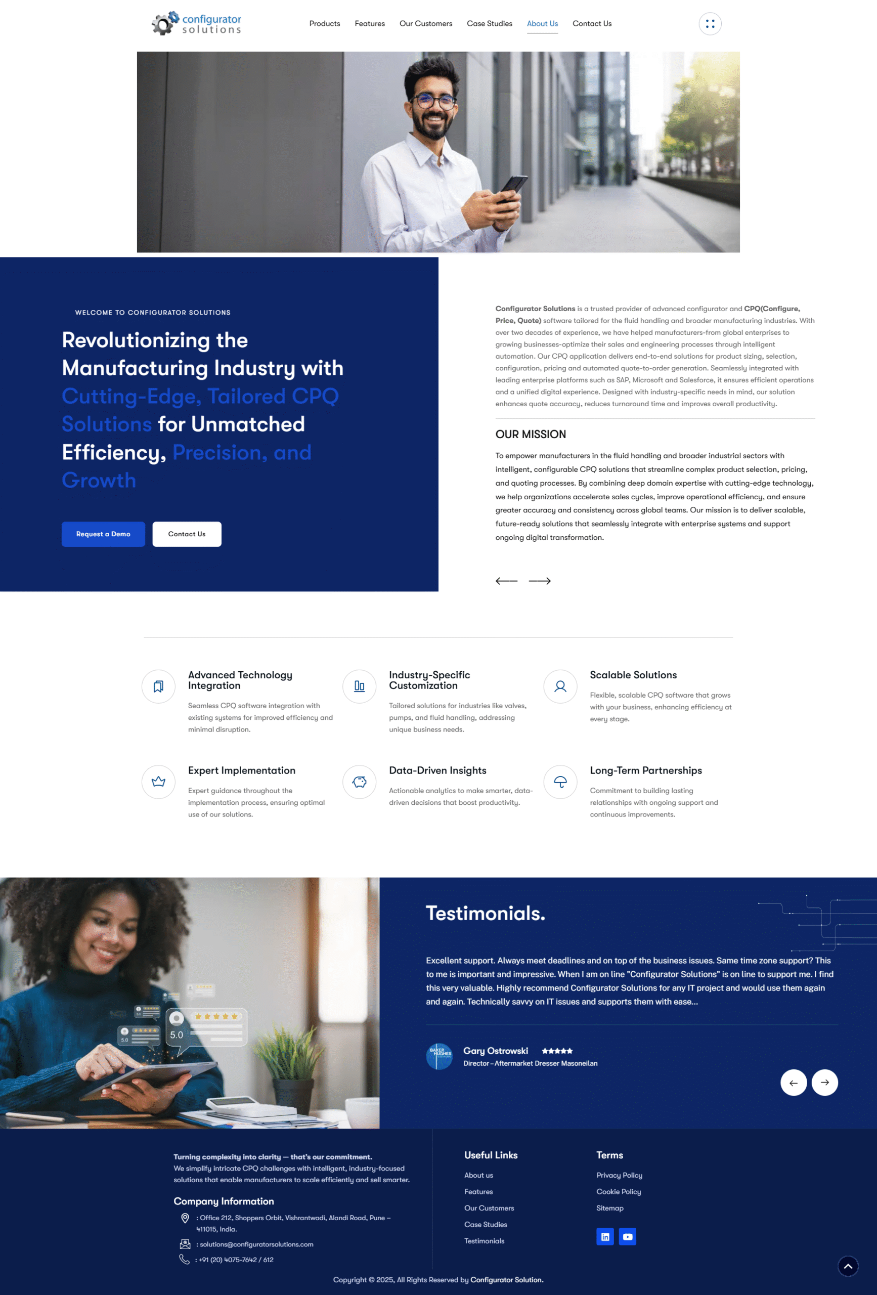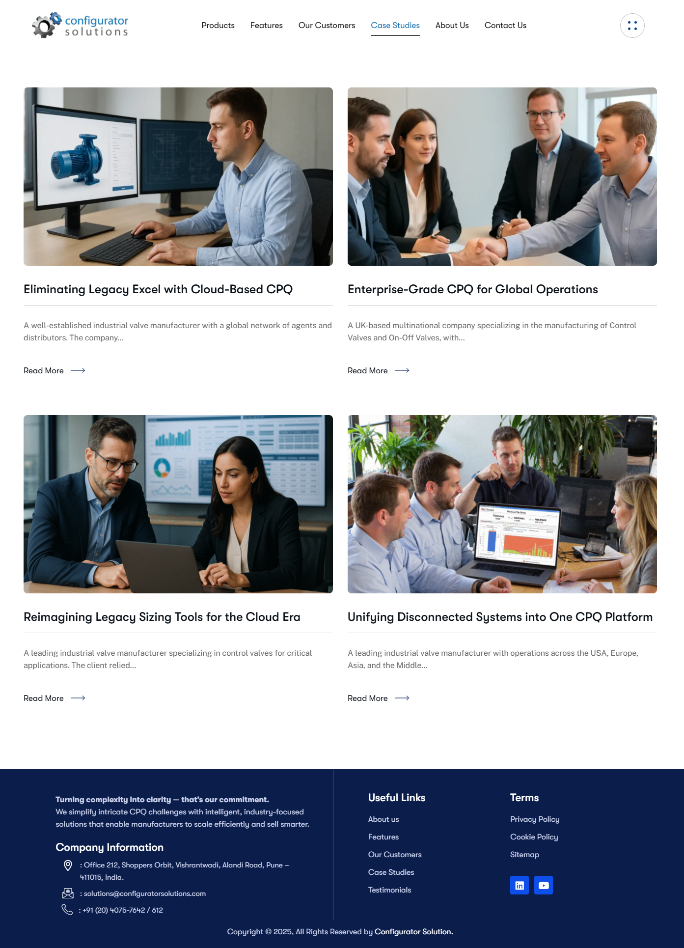 The client was suffering from the “Third Curse of Business Owners”: product obsession. Their old site was obsessed with its own technical features. Our role as the Guide was to shift their perspective. We guided them to stop selling “valve calculators” (a commodity) and start selling “outcomes” (a premium solution). This led to their new, powerful positioning: “AI-Enabled CPQ” that delivers “Intelligence and Speed”.