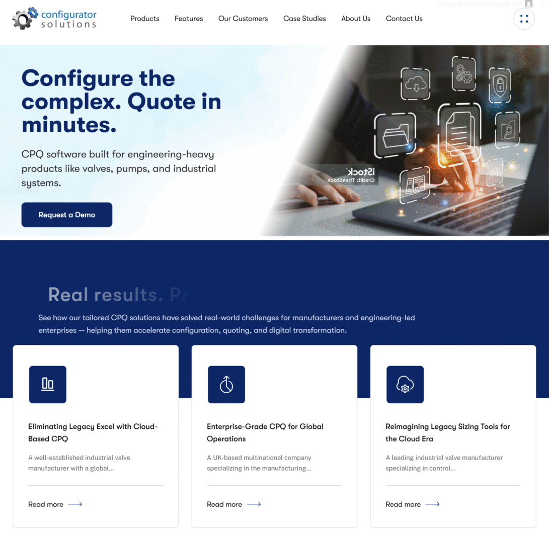 Configurator Solutions, an expert AI-CPQ provider , was suffering from “Digital Dissonance”: their outdated 2007 website was a liability. With broken images, confusing jargon, and mixed branding , the site signaled risk, positioned them as a commodity , and created a “Sales Gap” by repelling wary prospects. Our solution was a strategic Bridge to clarity. Instead of a simple “redesign,” we engineered a new platform built on psychological pillars: curing their “product obsession” by repositioning them as a premium solution, designing for “Cognitive Fluency” (where ease-of-use builds subconscious trust), and delivering an editable backend that provided true empowerment.